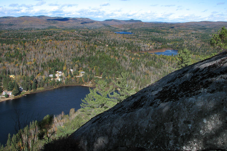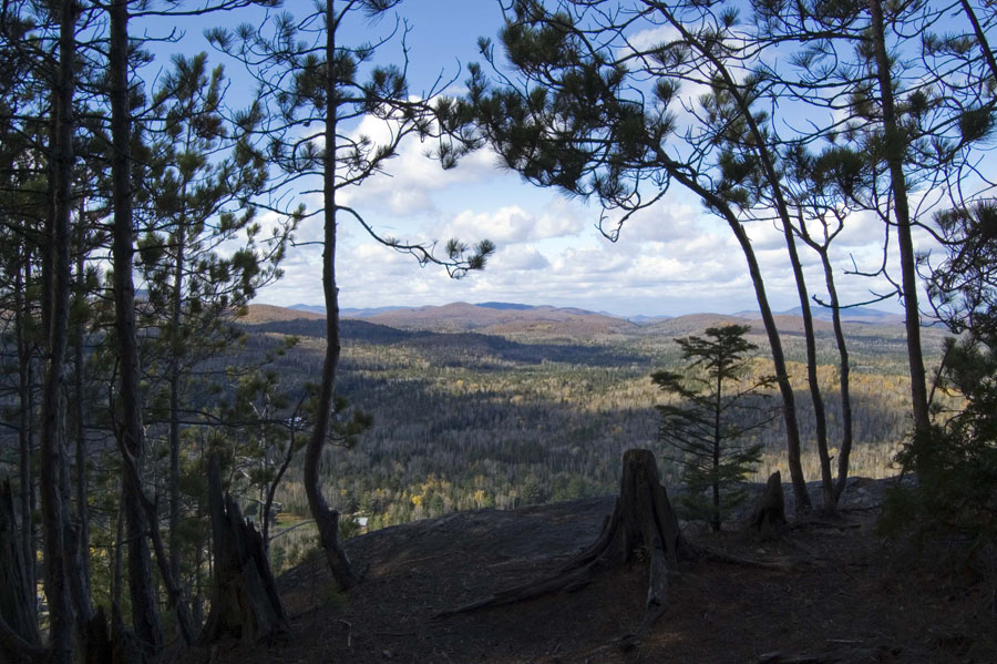 Nous reprenons le sentier. Nous marchons vers l’est, dans une belle forêt où il est possible de voir des pins rouges d’assez bonne taille. À l’occasion, nous aboutissons sur d’autres caps de roches. Ceux-ci nous offrent une vue vers le sud, et sur le petit lac Castor.