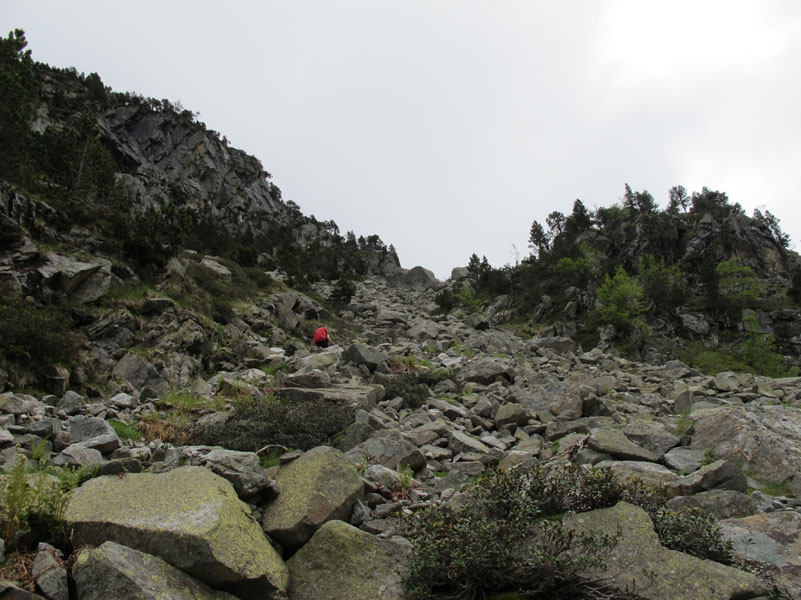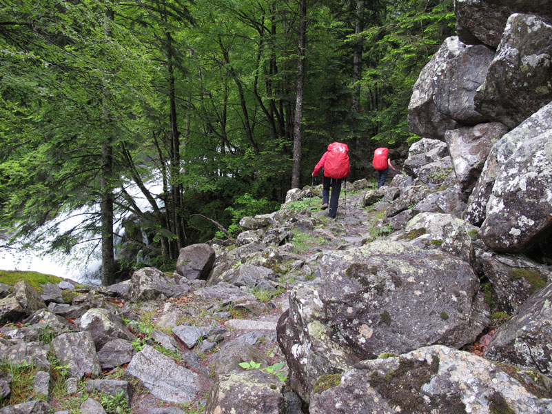 Puis nous retrouvons le GR10, qui longe la partie ouest du lac. Le sentier perd peu à peu ses allures de grands boulevards. La caillasse, s’impose. Le silence étouffe peu à peu la clameur des marcheurs rassemblés près de la restauration.