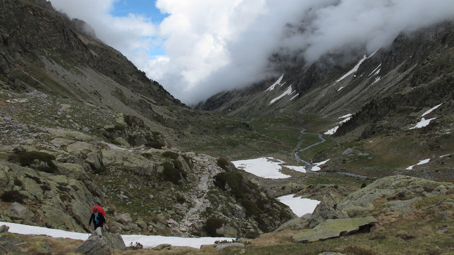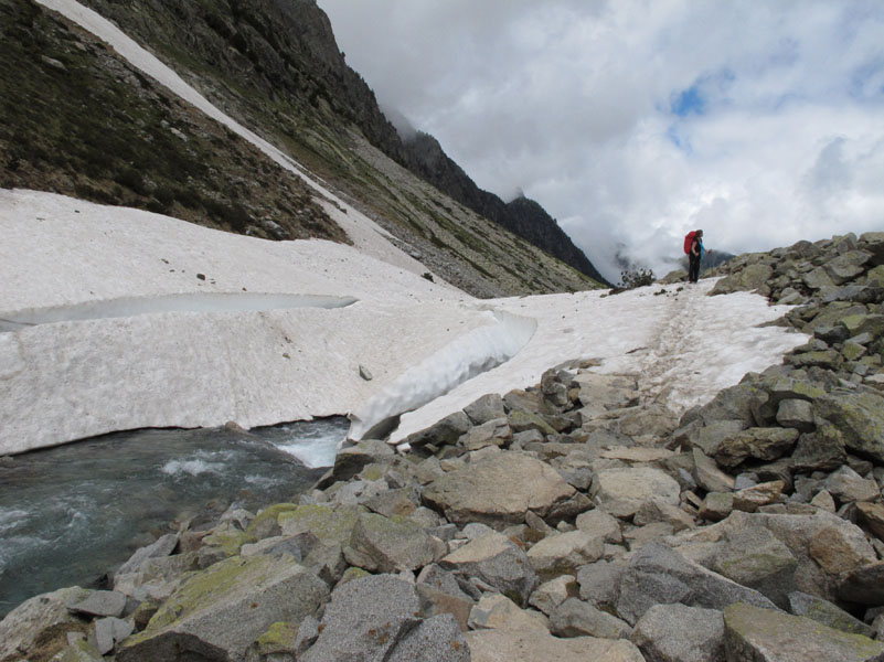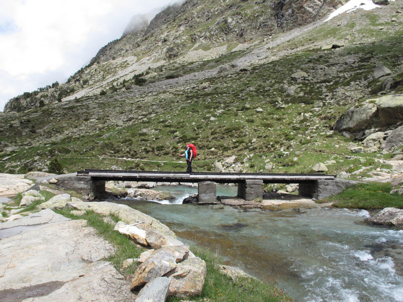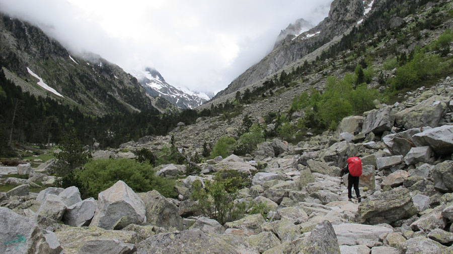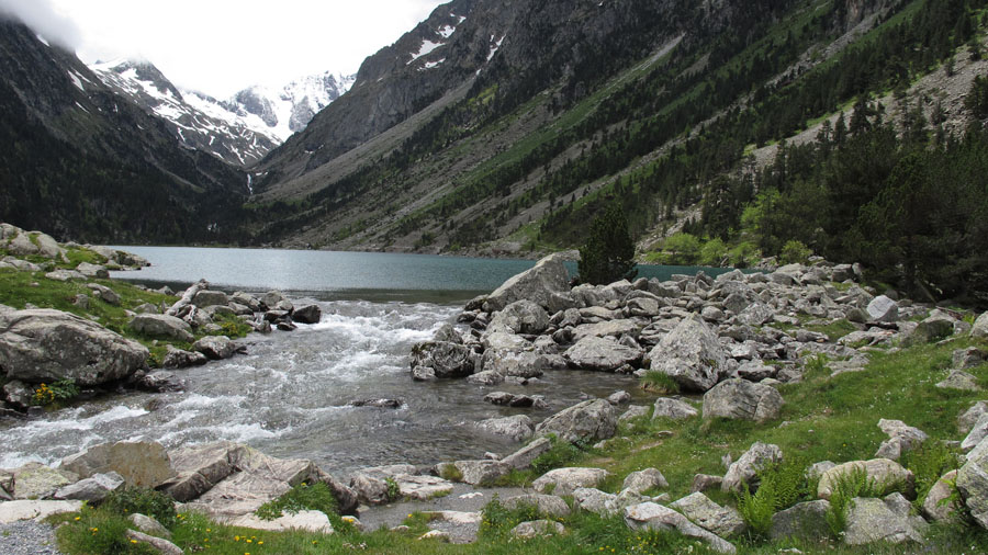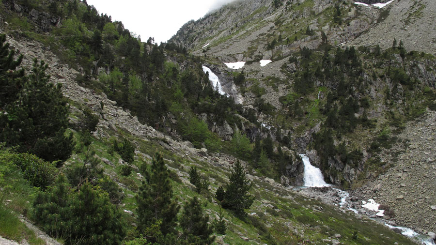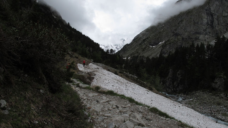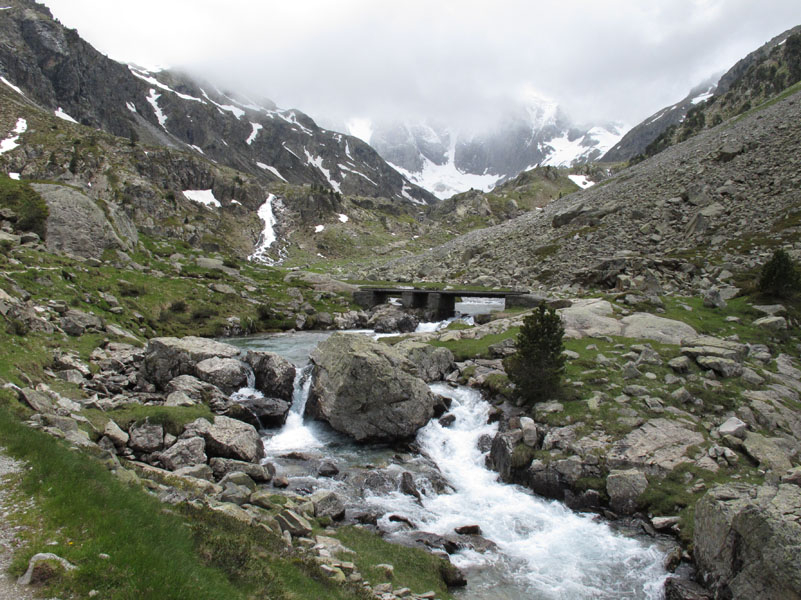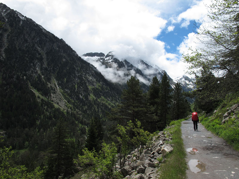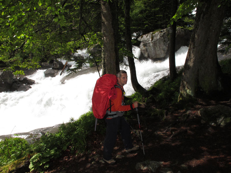 Enfin nous sommes en montagne. Peu de rencontre, le paysage est tout à fait à notre goût. De gros nuages montent derrière nous. Pour l’instant nous ne sommes pas trop menacés. Nous longeons le gave de Gaube, qui nous offre son eau cristalline, ses chutes et petites cascades.