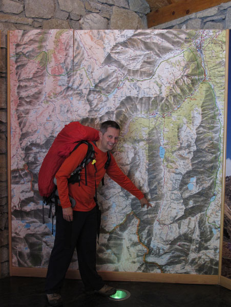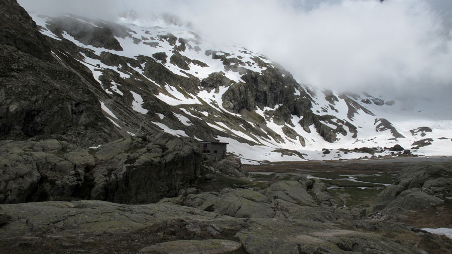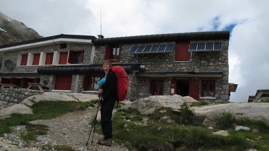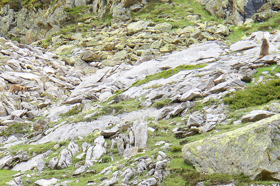 Un sifflement aigu et persistant se fait entendre. Une marmotte veut clairement indiquer à un renard, qu’elle l’a bien repéré, et qu’il est un peu trop près de sa propriété. Le renard s’éloigne. Je crois qu’il a été davantage intimidé par notre présence que par les cris alarmant de la marmotte. Le refuge est en vu. Pas facile de le détecter puisqu’il est encastré dans un décor rocheux où les couleurs s’harmonisent. Dommage que le brouillard et les nuages envahissent maintenant toute la place.