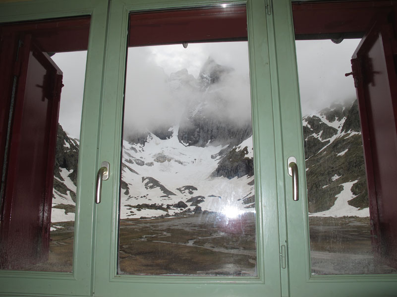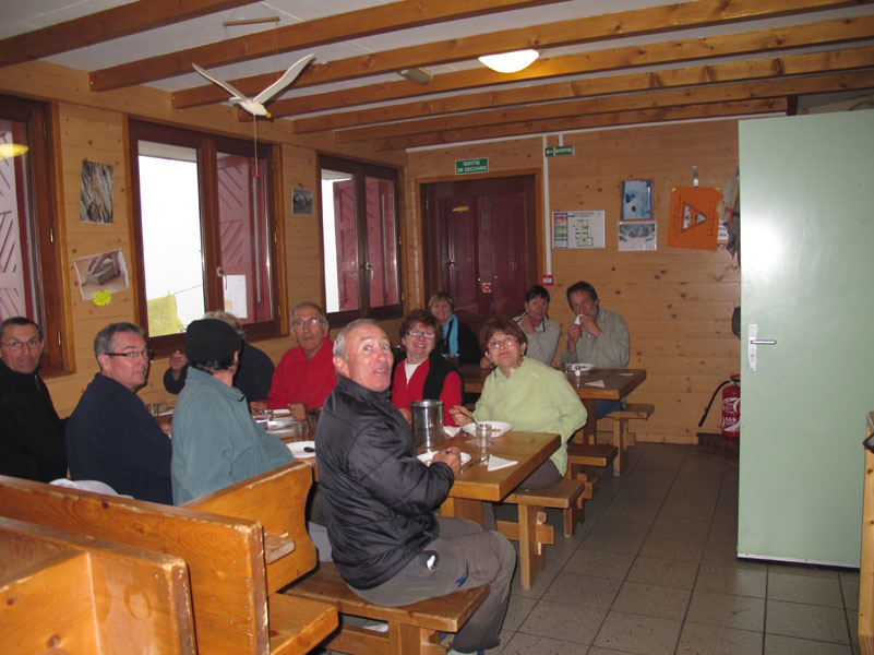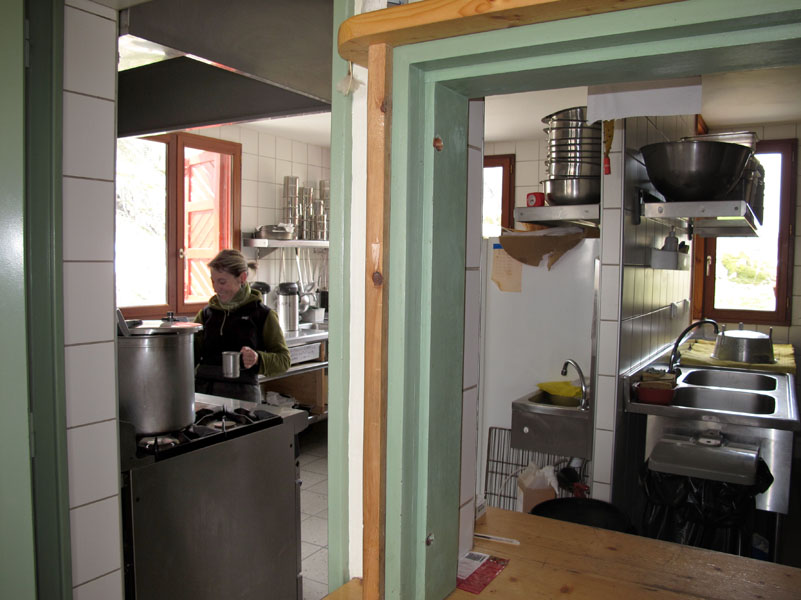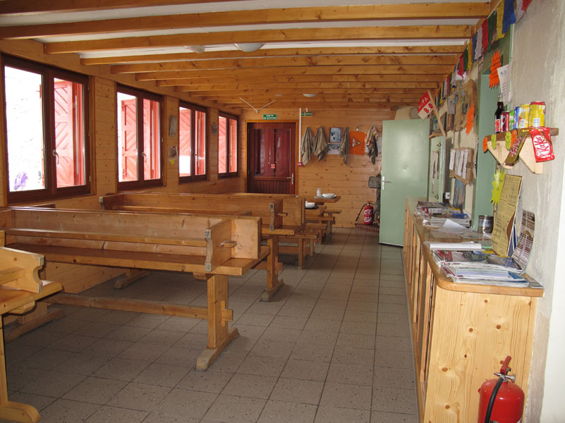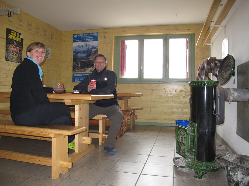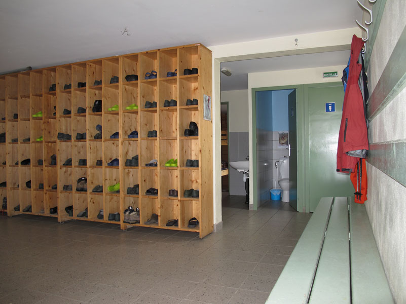 Le refuge a été rénové récemment. Il est très joli. Nous nous installons, puis allons boire quelque chose dans la seule petite salle où il y un peu de chauffage. Tout est parfait ici, le personnel est aimable, l’ambiance formidable. MAIS, l’humidité et le froid sont très difficile à supporter. Même avec le foulard, plusieurs chandails, et le manteau, on arrive difficilement à se détendre.