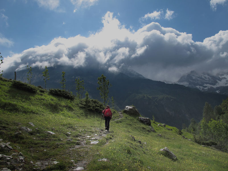 Le temps est encore plus moche aujourd’hui. Nous marchons vers les Granges de Holles. En haute saison, ce gîte accueille beaucoup de randonneurs. Il est situé directement sur le GR10. Juste un peu avant d’arriver, en traversant un ruisseau, je glisse et tombe une seconde fois sur le même côté. (avec cette fois la jambe gauche dans un tas de fumier). Je me relève encore sans trop de mal.