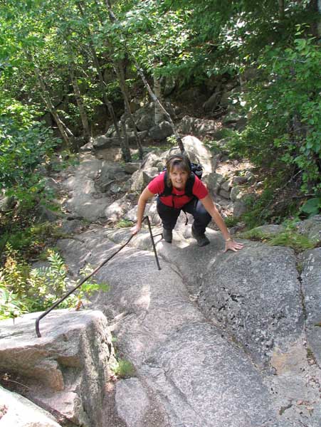 Nous réalisons rapidement que ce parc a beaucoup à offrir. Au cours de notre petite exploration, nous en profitons pour localiser l’entrée de la piste. Nous ne pouvons par résister à l’envie d’y effectuer quelques pas. Dès le début, il faut monter sur un gros caillou. Cela demande une certaine force physique et un peu de souplesse. C’est comme si ce premier obstacle, servait d’avertissement à toute personne qui aurait mal évalué le type de sentier. Enthousiasmés, nous revenons sur nos pas en souhaitant que demain arrive au plus vite! Nous terminons notre journée au port de Bar Harbor.