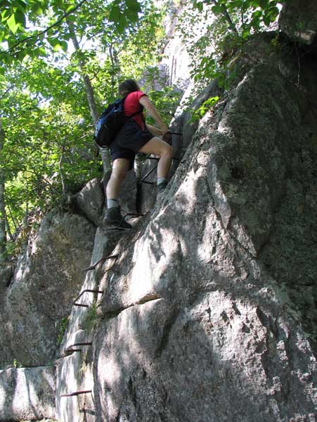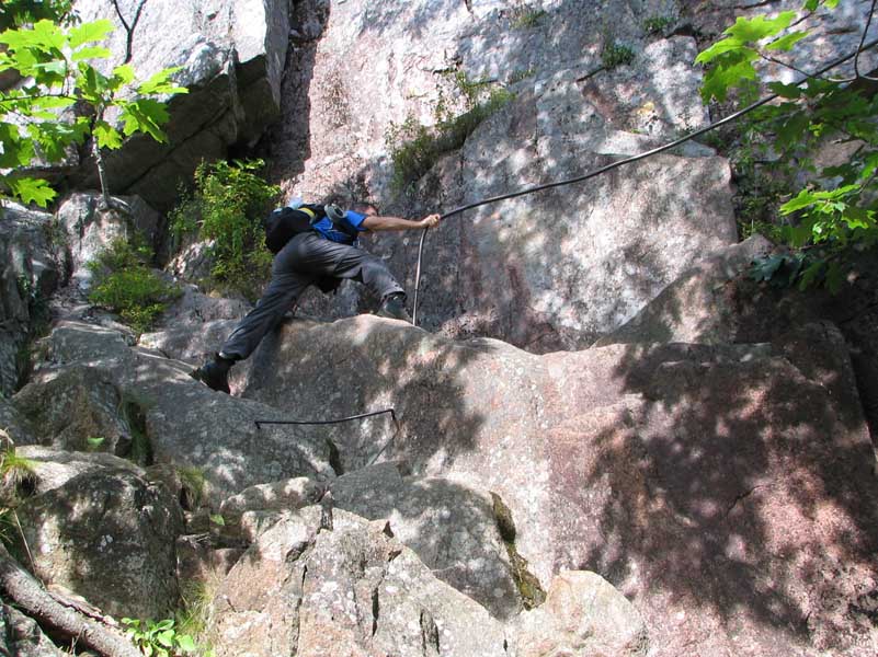 Un parcours parsemé d’éléments de Via Ferrata. Pourtant, pas de casque, pas de baudrier et pas de mousquetons. Il faut faire confiance à nos mains et à nos pieds, et user de prudence.